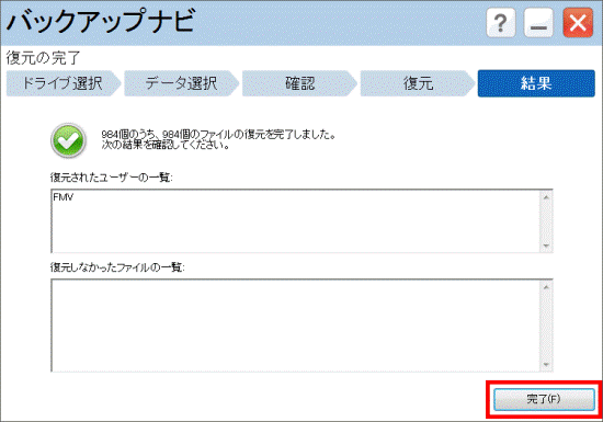 復元の結果を確認し、「完了」ボタンをクリックします。