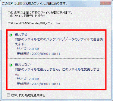 なお、すべてのデータに対して同じ処理(「復元する」、あるいは、「復元しない」)を適用する場合は、「以降、同じ処理を適用する」をクリックし、チェックを付けます。 - バックアップした時点の状態に戻す場合