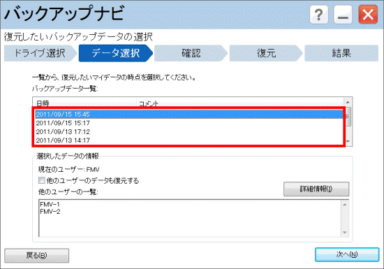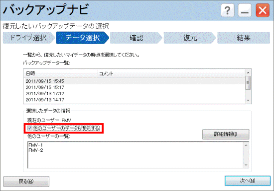 バックアップしたときと違うユーザー名では正常に復元できない可能性があります。 - 他のユーザーのデータを復元する場合、自分以外のユーザーのデータも指定した時点に復元してしまいます。