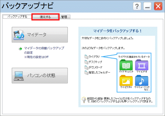 「バックアップナビは、大切なデータをバックアップするためのソフトウェアです。」と表示されない場合は、次の手順に進みます。 - 「復元する」タブをクリックします。