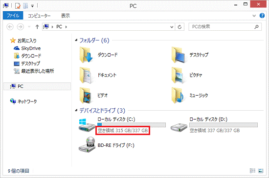 - 上の手順で表示されない場合は、ハードディスクドライブのアイコンを右クリックして表示されるメニューから「プロパティ」をクリックし、「空き領域」を確認してください。