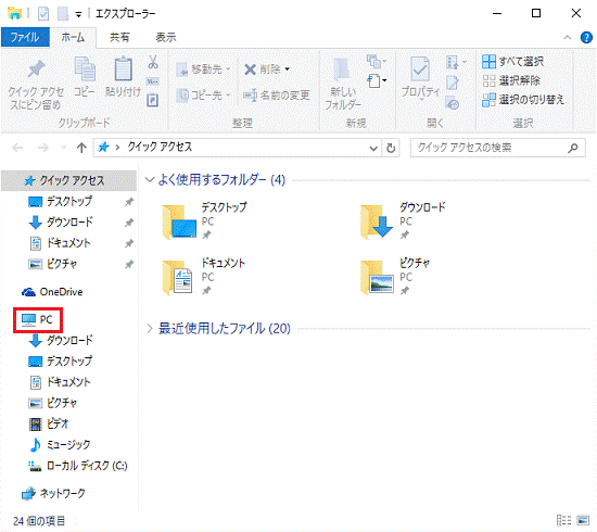 - 「ローカルディスク(C:)」を右クリックし、表示されるメニューから「プロパティ」をクリックします。