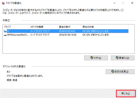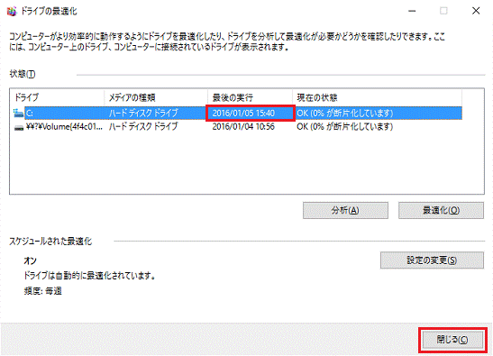 - ディスクデフラグが完了すると、「最後の実行」に実行した日付が表示されます。