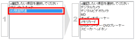 他社周辺機器動作確認情報で機種を選択した後、周辺機器の分類を選択する画面が表示された場合は、「AV機器関連」→「メモリカード」の順にクリックしてください。