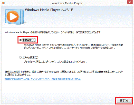 「Windows Media Player へようこそ」と表示されたら、「推奨設定」をクリックし「完了」ボタンをクリックします。