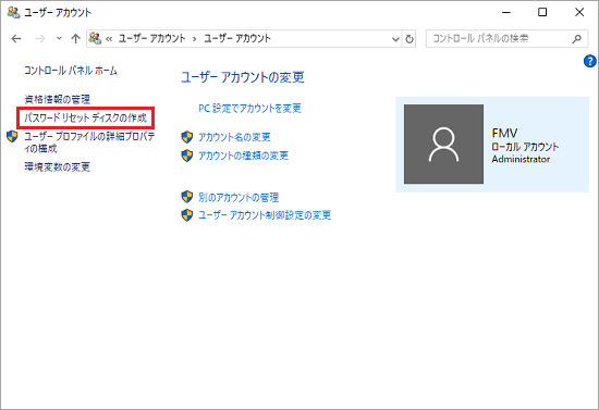 画面左側の「パスワードリセットディスクの作成」をクリックします。