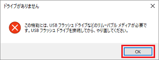 アドバイス「ドライブがありません」と表示された場合は、「OK」ボタンをクリックして、USBフラッシュメモリなど、書き込み可能なリムーバブルメディアがパソコンにセットされているかどうかを確認してください。