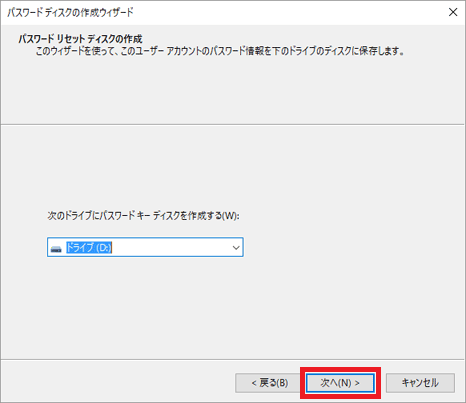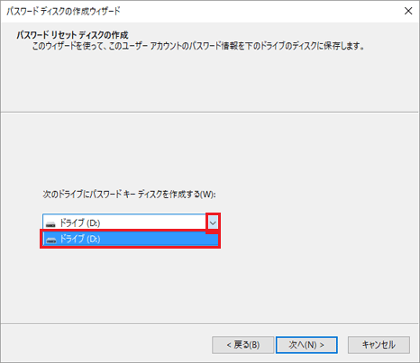 」ボタンをクリックし、表示される一覧から、パスワードリセットディスクのドライブをクリックします。 - 「次へ」ボタンをクリックします。