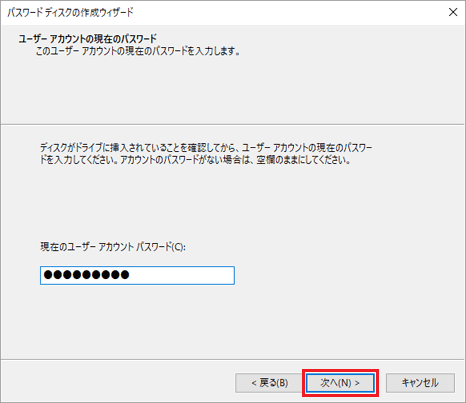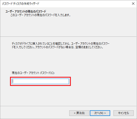 「次へ」ボタンをクリックします。 - 「パスワードリセットディスクの挿入」と表示されます。