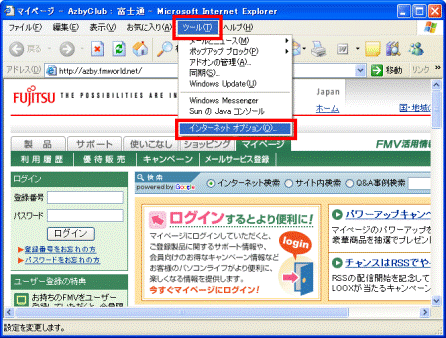 - 「ツール」メニュー→「インターネットオプション」の順にクリックします。