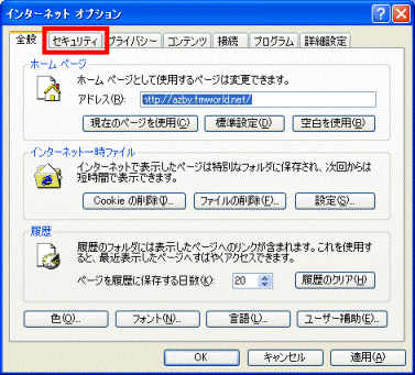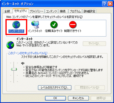 - 「Web コンテンツのゾーンを選択してセキュリティのレベルを設定する」欄の、「インターネット」をクリックします。