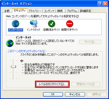 - 「このゾーンのセキュリティのレベル」欄の、「レベルのカスタマイズ」ボタンをクリックします。