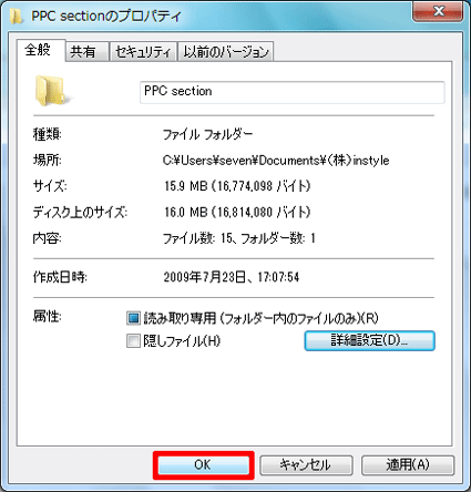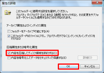 - 「圧縮属性または暗号化属性」欄の「内容を圧縮してディスク領域を節約する」にチェックを付け、「OK」ボタンをクリックします。