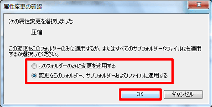 - フォルダ内にある、ファイルやサブフォルダーも圧縮するかどうかを選択し、「OK」ボタンをクリックします。
