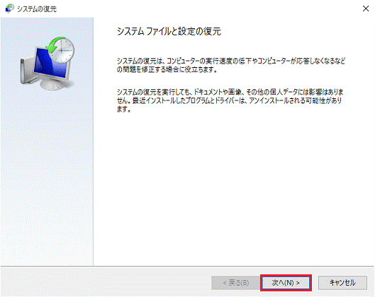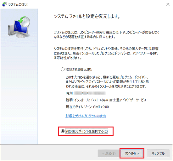 「別の復元ポイントを選択する」をクリックして、「次へ」ボタンをクリックします。