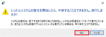- 「いったんシステムの復元を開始したら、中断することはできません。続行しますか?」と表示されます。