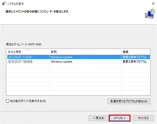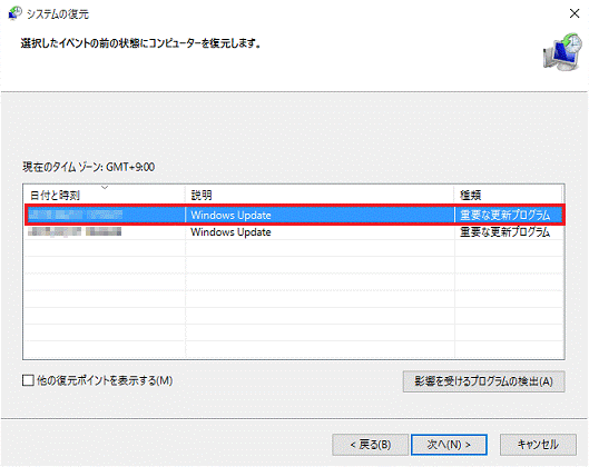 アドバイス- 「他の復元ポイントを表示する」が表示されている場合は、クリックしチェックを付けると、過去の復元ポイントも一覧に表示されます。