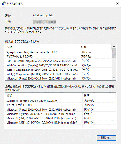 Windows 10 Creators Update以降が適用されていない場合、システムの復元を実行すると、エラーが発生し、正しく完了しないことがあります。