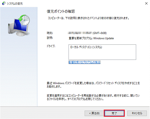 復元ポイントの時刻や説明を確認し、復元して問題がなければ「完了」ボタンをクリックします。