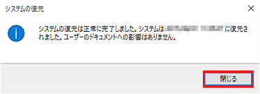 完了するまで、そのまましばらく待ちます。 - システムの復元が完了するとパソコンが再起動し、「システムの復元は正常に完了しました。」と表示されます。