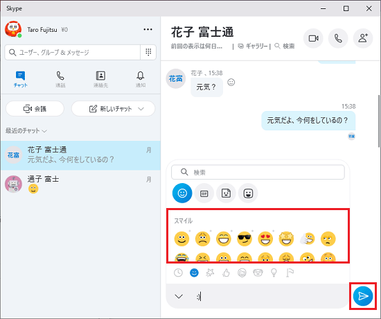 - 送信したい絵文字をクリックして、【Enter】キーを押すか、「
