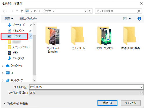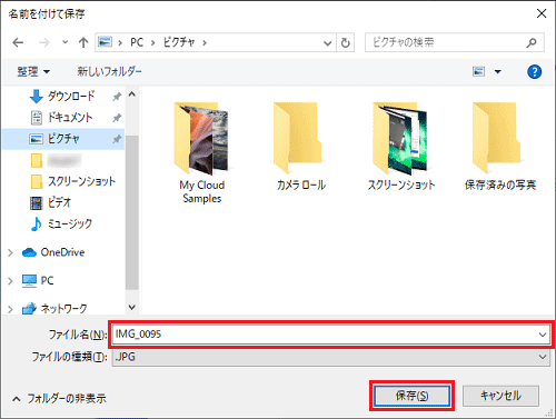 (ピクチャに保存する場合) - ファイル名をお好みで設定して、「保存」ボタンをクリックします。