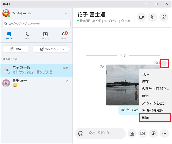 送信相手のSkypeからメッセージやファイルを削除することができます。
