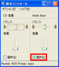次の機種をお使いの場合は、「Audio Input」の「選択」をクリックし、チェックを付けます。- 2006年秋冬モデル FMV-BIBLO NB70T、NB70TN、NB50T