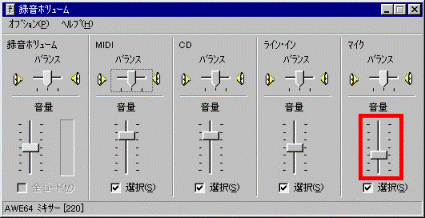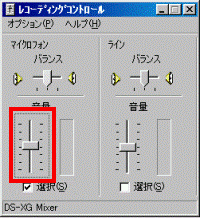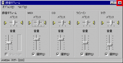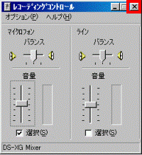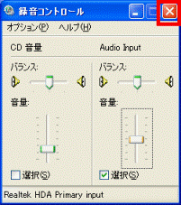 目盛りの下の方をクリックすると、録音音量が小さくなります。 - 「×」ボタンをクリックし、「レコーディングコントロール」を閉じます。