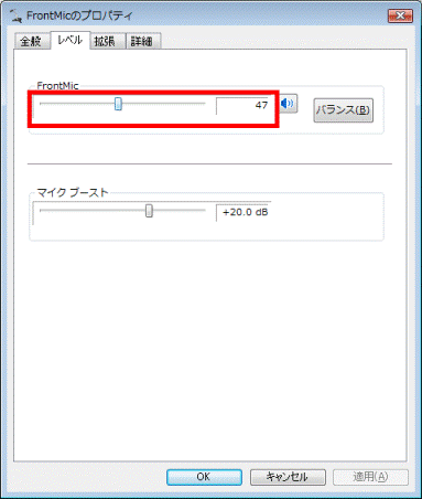 - 「FrontMic」(または「マイク」など)欄のつまみをクリックします。