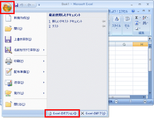 「Office」ボタン→「Excelのオプション」の順にクリックします。
