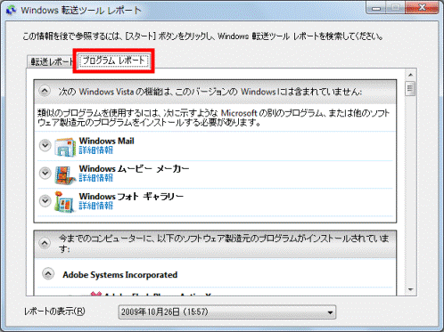 「スタート」ボタン→「すべてのプログラム」→「アクセサリ」→「システムツール」→「Windows 転送ツール レポート」