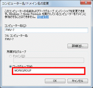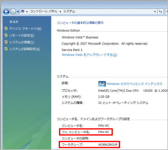 「フルコンピュータ名」と「ワークグループ」を確認します。