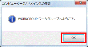 「(ワークグループ名)ワークグループへようこそ」と表示される場合は「OK」ボタンをクリックします。