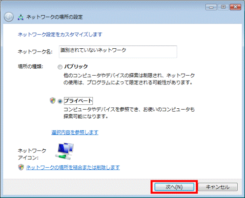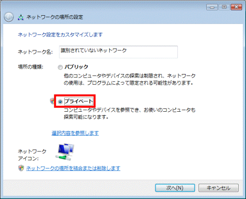 - 「ネットワークの探索とファイル共有」が表示される場合は「いいえ、接続しているネットワークをプライベートネットワークにします」をクリックします。