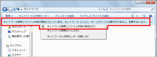 ツールバーの下に表示される情報バーをクリックして、表示されるメニューから「ネットワークの探索とファイル共有の有効化」をクリックします。