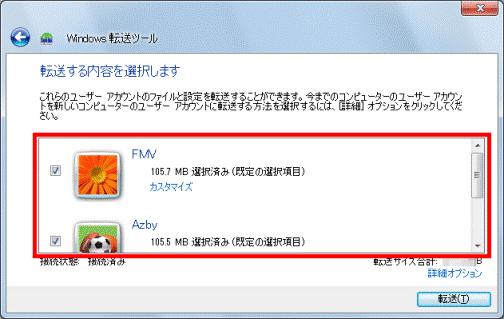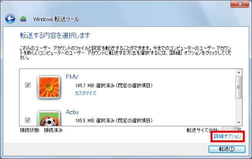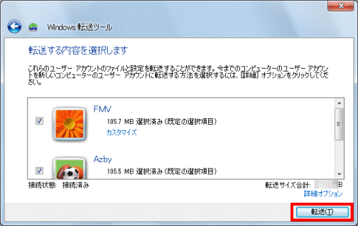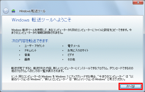 ユーザーアカウント制御が表示された場合は、「続行」をクリックします。 - 「Windows 転送ツール」が表示されます。