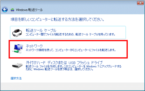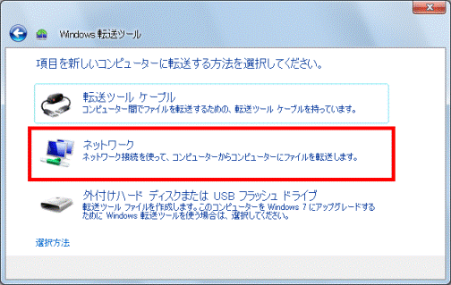- 「項目を新しいコンピューターに転送する方法を選択して下さい」と表示されます。