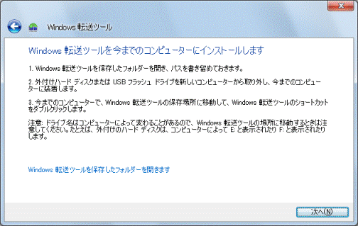 - 「Windows 転送ツールを今までのコンピューターにインストールします」と表示されます。