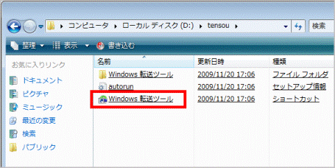 「スタート」ボタン→「コンピューター」→「ローカルディスク(D:)」→Windows 転送ツールを保存するために作成したフォルダーの順にクリックします。 - フォルダーが表示されます。