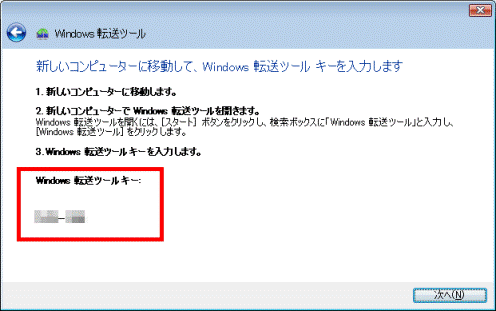 表示されたWindows 転送ツールキーを確認し、新しいパソコンに移動します。