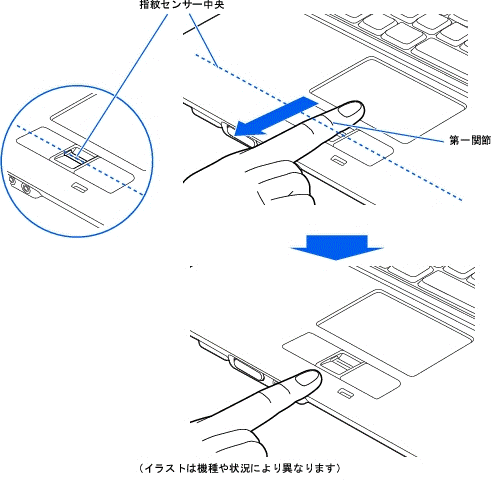 - 指の第一関節より先の部分が、指紋センサーの上を通過するようにしてください。