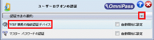 その場合、OmniPass という文字の右下にある「▼」ボタンをクリックし、表示される一覧から次のいずれかの項目をクリックすると、もう一度指紋入力の画面が表示され、指紋の認証ができるようになります。- WBF準拠の指紋認証デバイス