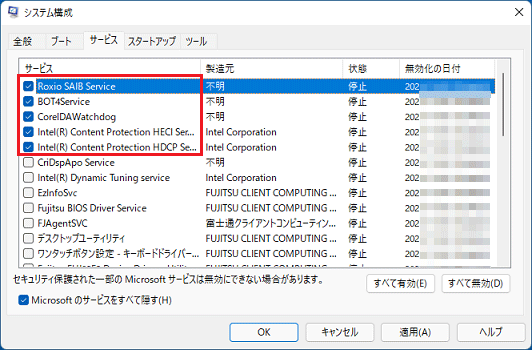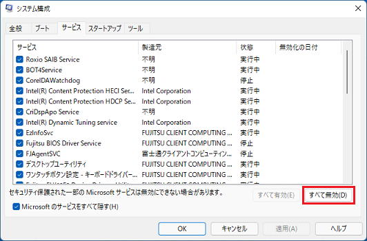 - 項目名をメモに控えたら、「すべて無効」ボタンをクリックします。
