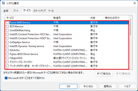 「サービス」欄に表示されている項目のうち、チェックが外れている項目名をメモに控えます。