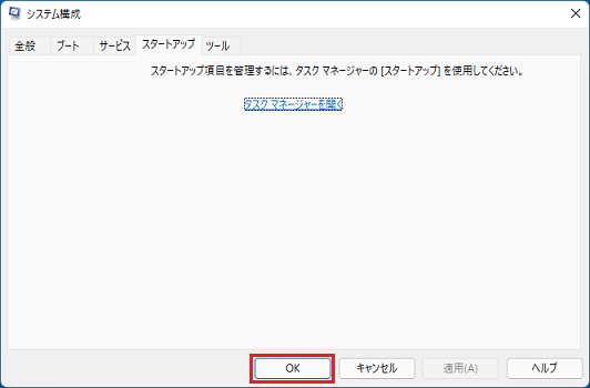 - 「スタートアップ項目を管理するには、タスクマネージャーの [スタートアップ] を使用してください。」と表示されます。
