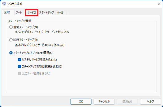 - 「システム構成」または、「System Configuration」の「サービス」タブをクリックします。