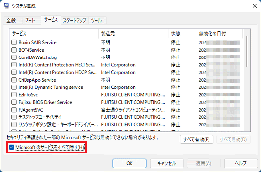 - 「Microsoft のサービスをすべて隠す」をクリックし、チェックを付けます。