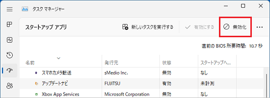 「状態」の一覧に「無効」と表示されている項目名を、メモに控えます。