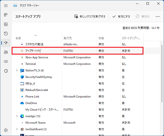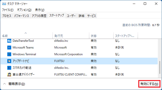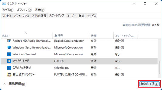 スタートアップの項目をクリックします。アドバイス控えていたメモを元に、はじめから「状態」の欄が「無効」だった項目名をクリックしないように注意します。